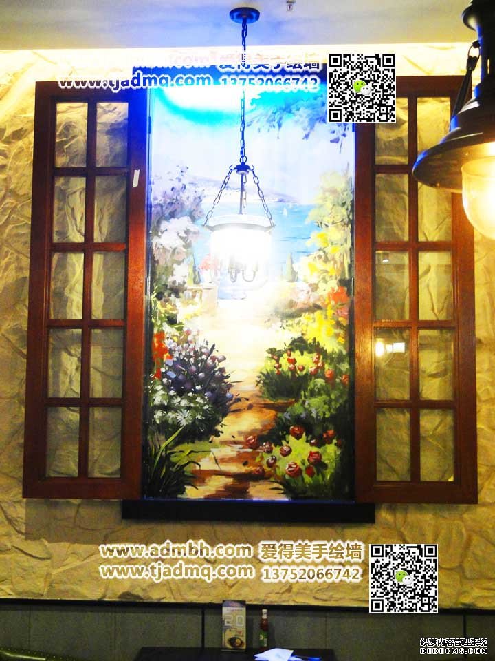 塘沽永旺豪尚豪牛排老板需要畫風(fēng)景畫,在室內(nèi)打開的加窗戶中間畫縱深感的風(fēng)景畫。畫后墻面都是墻體彩繪效果。